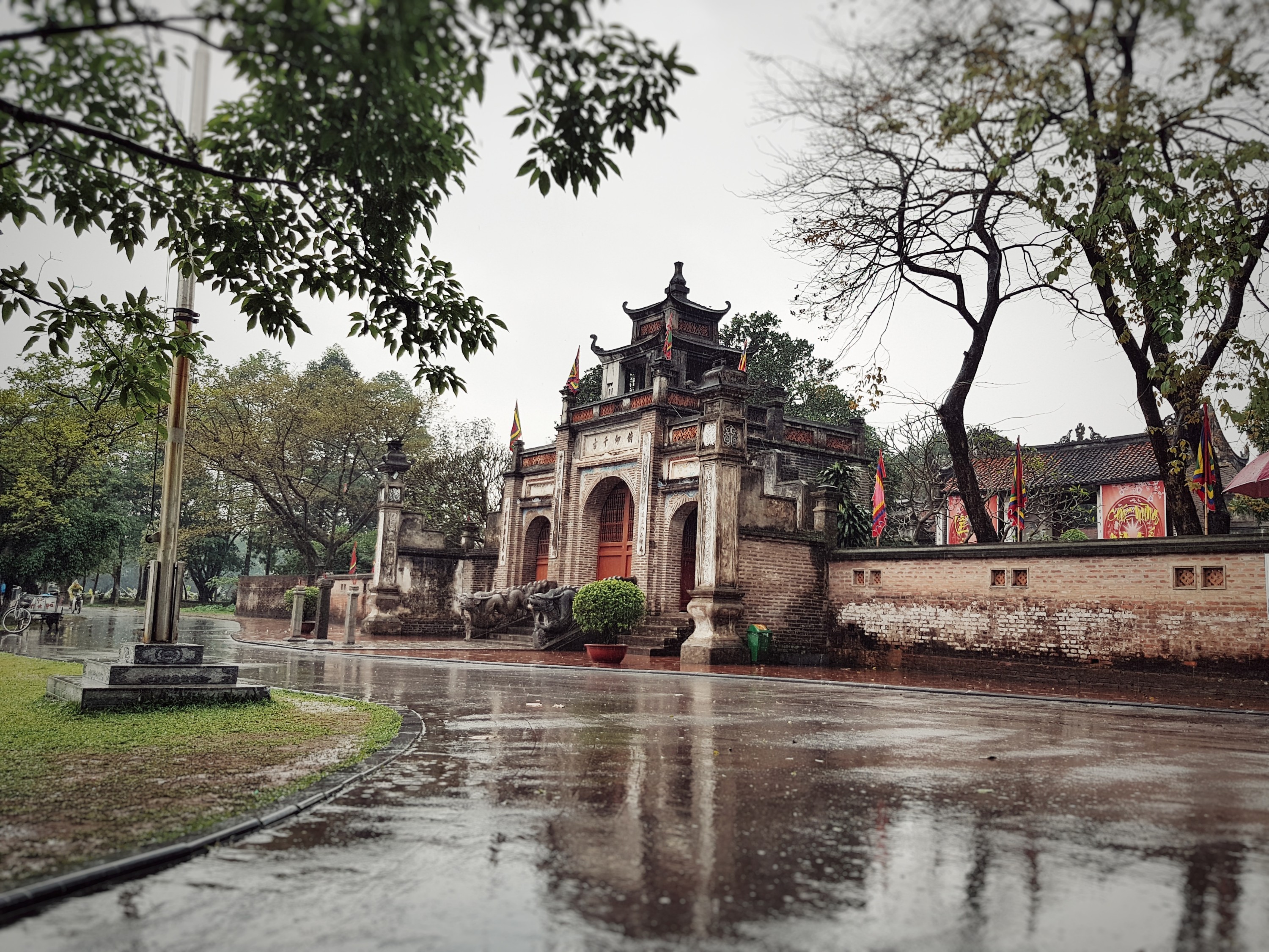 Mit dem Roller haben wir uns dann also auf den Weg gemacht zur uralten Stadt Co Loa. Mit dem Roller durch den Regen war alleine schon eine Erfahrung. Seit ich in Vietnam bin und auf jedes Mal wenn ich auf dem Roller mitfahre denke ich, ich muss sterben. Jeder fährt wo er will und wie er will, weder Fahrspuren noch Ampeln werden respektiert und wenn man an eine Kreuzung kommt hupt man einfach um zu sagen: „hier bin ich geht mir aus dem Weg während man sich durch die Massen an Autos und Rollen durchfädelt. Um ehrlich zu sein so stressig es auch ist, es macht doch auch Spaß mit dem Roller zu fahren!