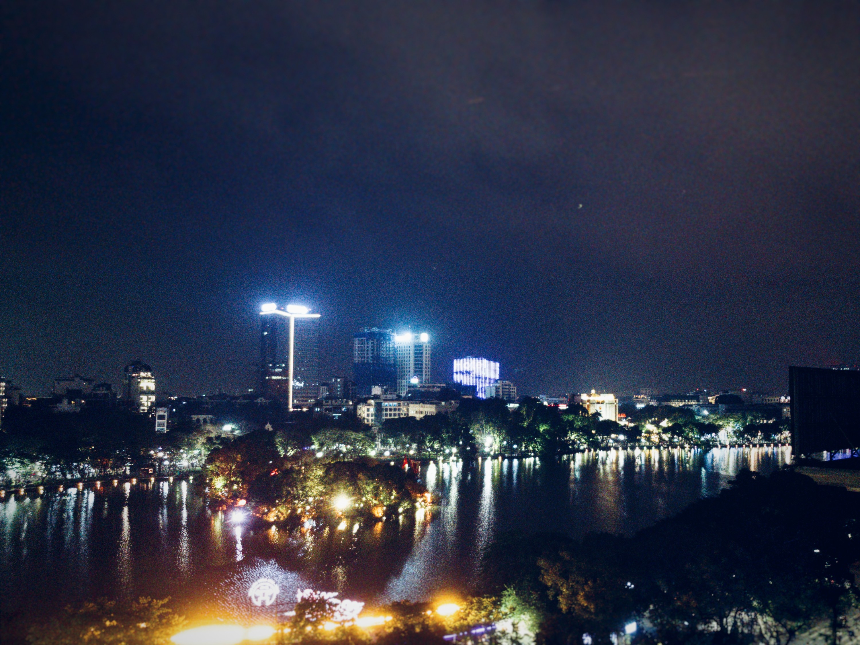 Unsere Aussicht aus dem Hotel auf den Hoan-Kiem-See bei Nacht